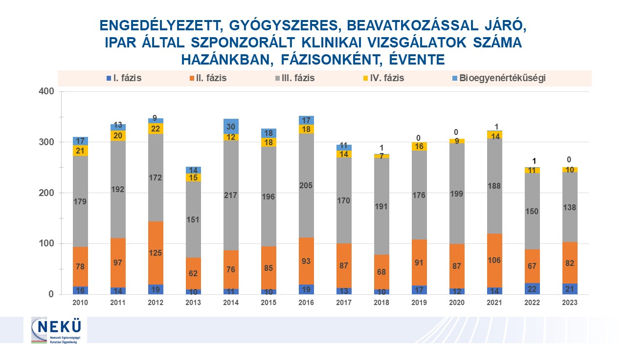 - Engedélyezett klinikai vizsgálatok száma Magyarországon vizsgálati fázisok szerint 2010–2023