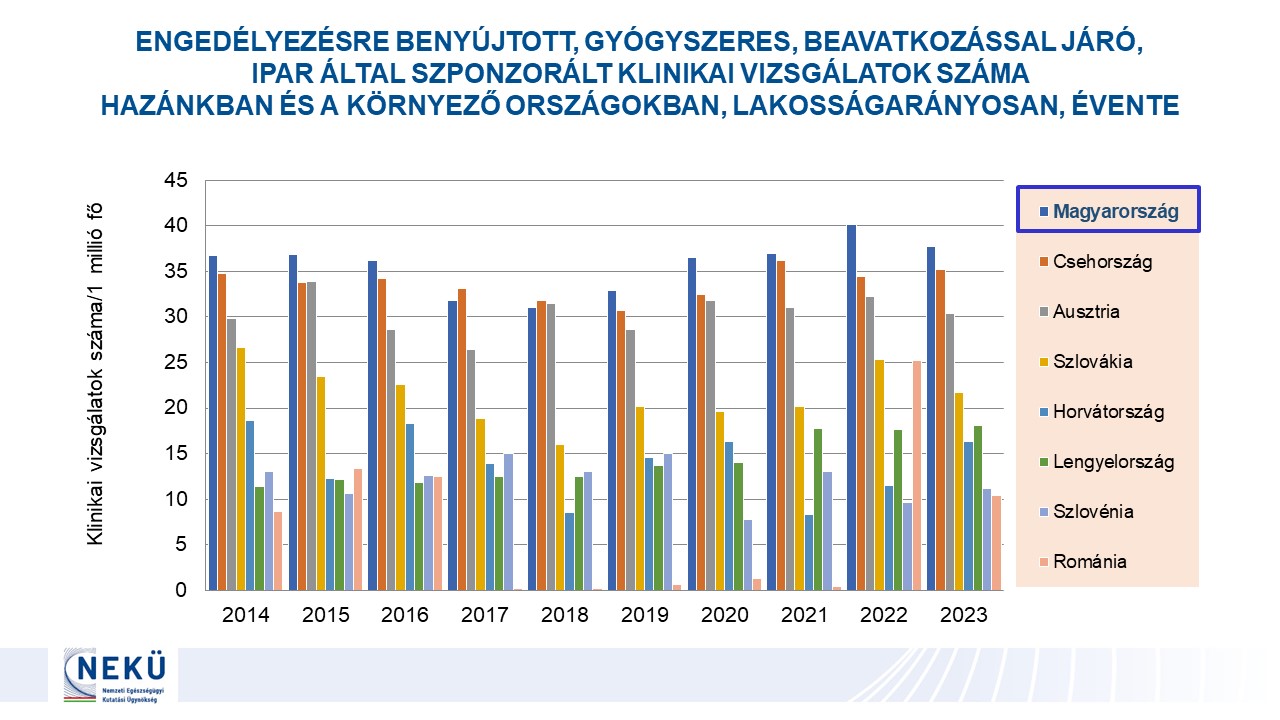 - Engedélyezésre benyújtott klinikai vizsgálatok száma Magyarországon és a környező országokban lakosságarányosan 2014-2023