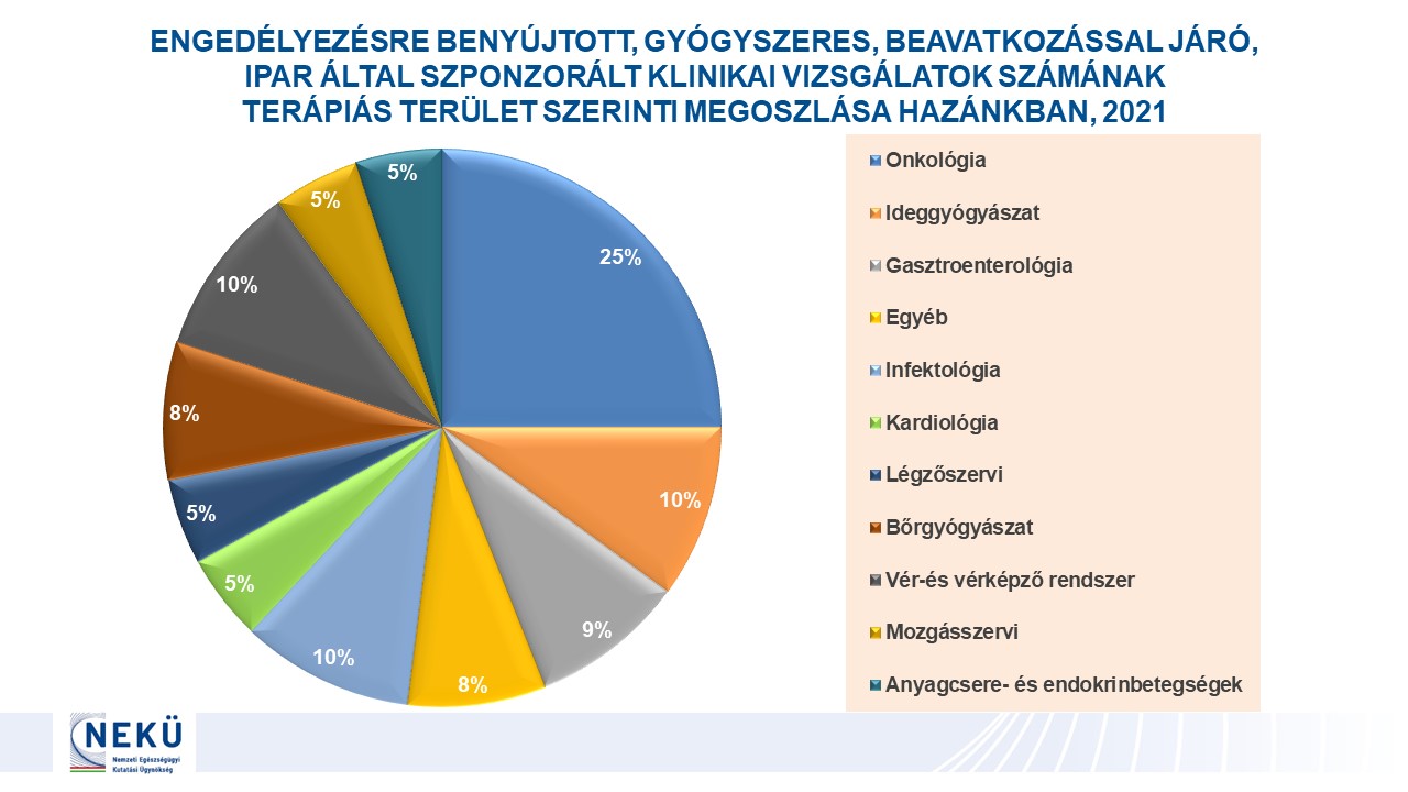 - Engedélyezésre benyújtott klinikai vizsgálatok száma Magyarországon terápiás területek szerint 2021